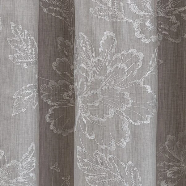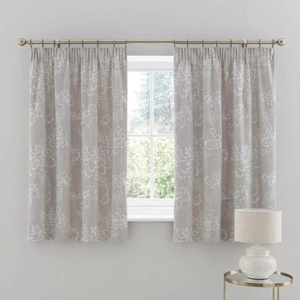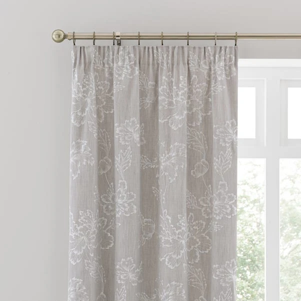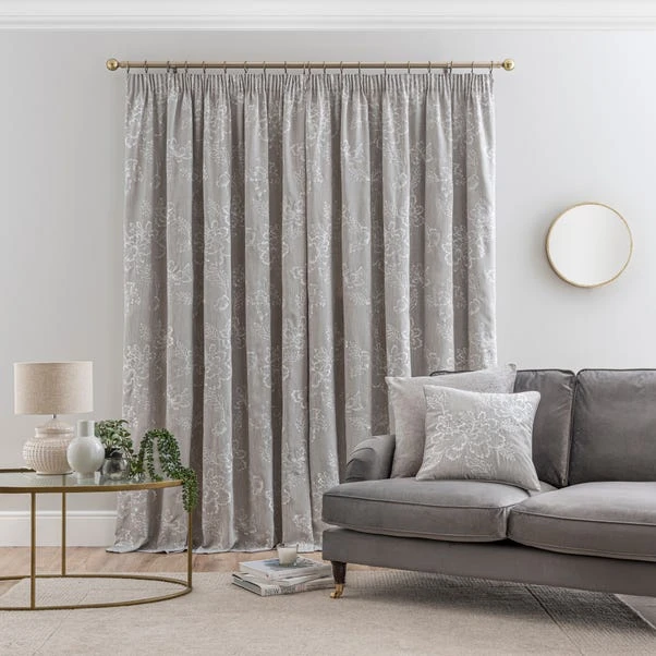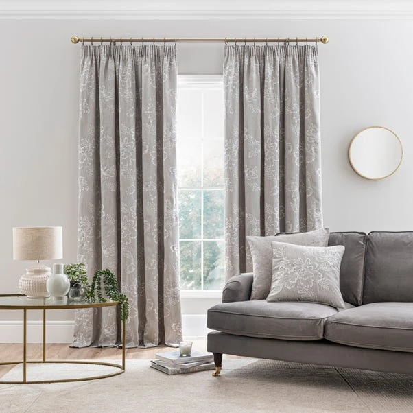 These timeless pencil pleat curtains boast beautiful blossoms and leaves in off-white finely embroidered onto a grey backdrop. The subtle colourway will create a sophisticated look in any room of your home. Fully lined for added fullness and drape, this pair of Flourish curtains are available in a large variety of sizes to suit your room. Pair with coordinating cushions to complete the look.
