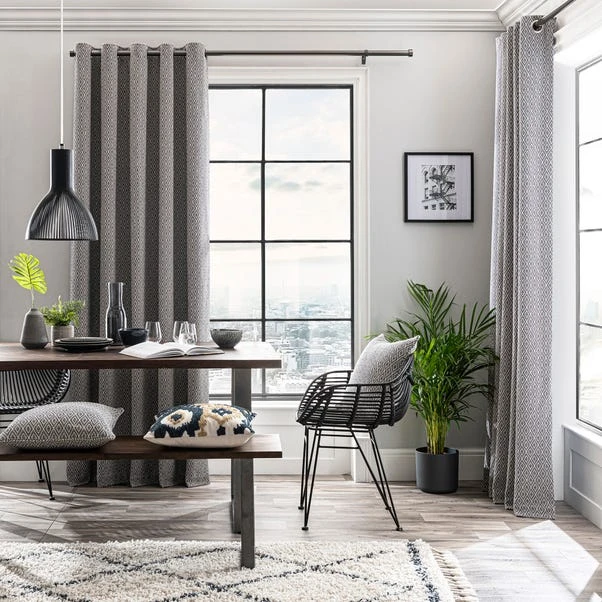 Patterned with a geometric print in a stylish blue colourway, this pair of Oslo curtains by Elements would make a stunning addition to any room. Designed with a quality lining for improved privacy and insulation, these modern curtains come complete with a sleek eyelet header and are available in a selection of sizes to suit your needs.