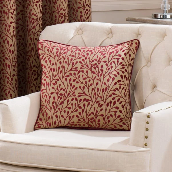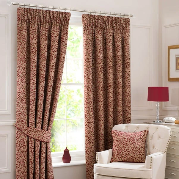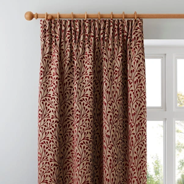 Decorated with a red trailing leaf print of a cream base, this pair of lined pencil pleat curtains are available in a choice of sizes.